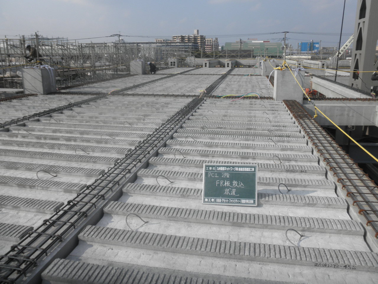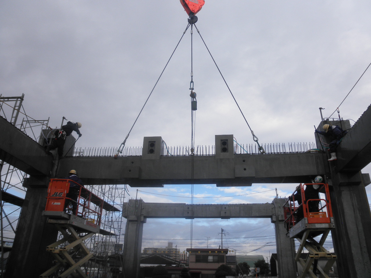 This project involved the construction in Shime Town of a building with four stories above ground plus a one-story penthouse. Fuji P.S delivered the pillars, beams, seismic isolation blocks and PC floor slabs. The members were manufactured at our Kotake plant and assembled on-site. Assembly was performed using pressure bonding with PC steel members. By using precast members manufactured in a plant, this saved on labor during construction and ensured the reliability of the finished product members. |