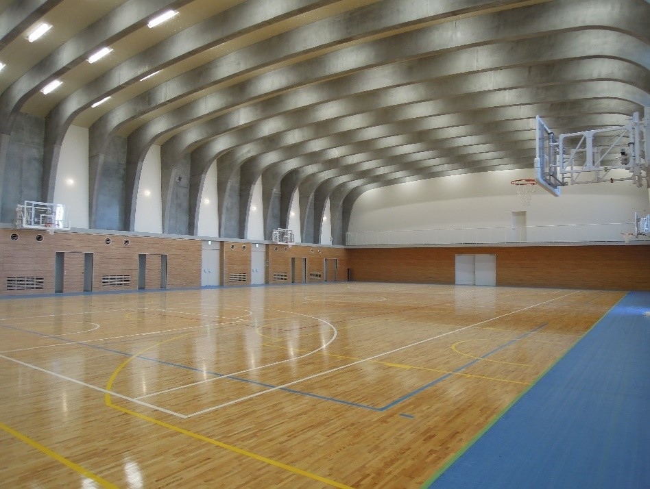 This project involved the construction of a new gymnasium for Tokyo Future University. Pillar, beam and slab PCa members were manufactured at our plant and assembled on-site. Assembly was performed using prestress pressure bonding. Eighteen rows of a curved frame with a span of 25 m were arranged at a pitch of 2.1 m to create a large, innovatively designed space. In addition, the building frame was erected in two months, thereby contributing to a shortened construction period. This project made full use of the design innovation and construction period shortening potential which characterizes the PCaPC method. |
