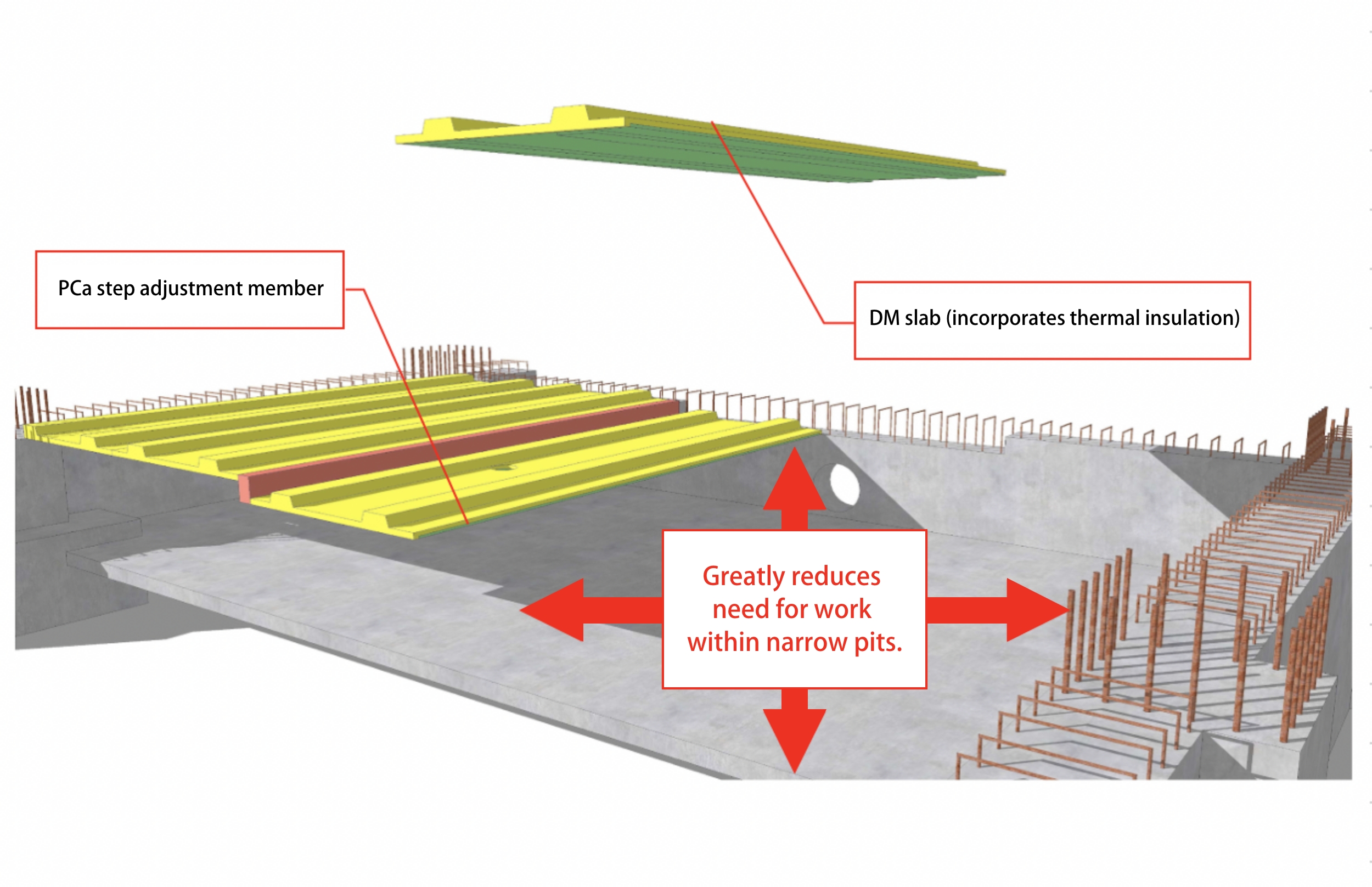 No-shoring construction is possible with DM slabs; by using them as the 1st-floor slabs which are installed over a pit, it eliminates the need to perform shoring work and form removal work within a narrow pit.