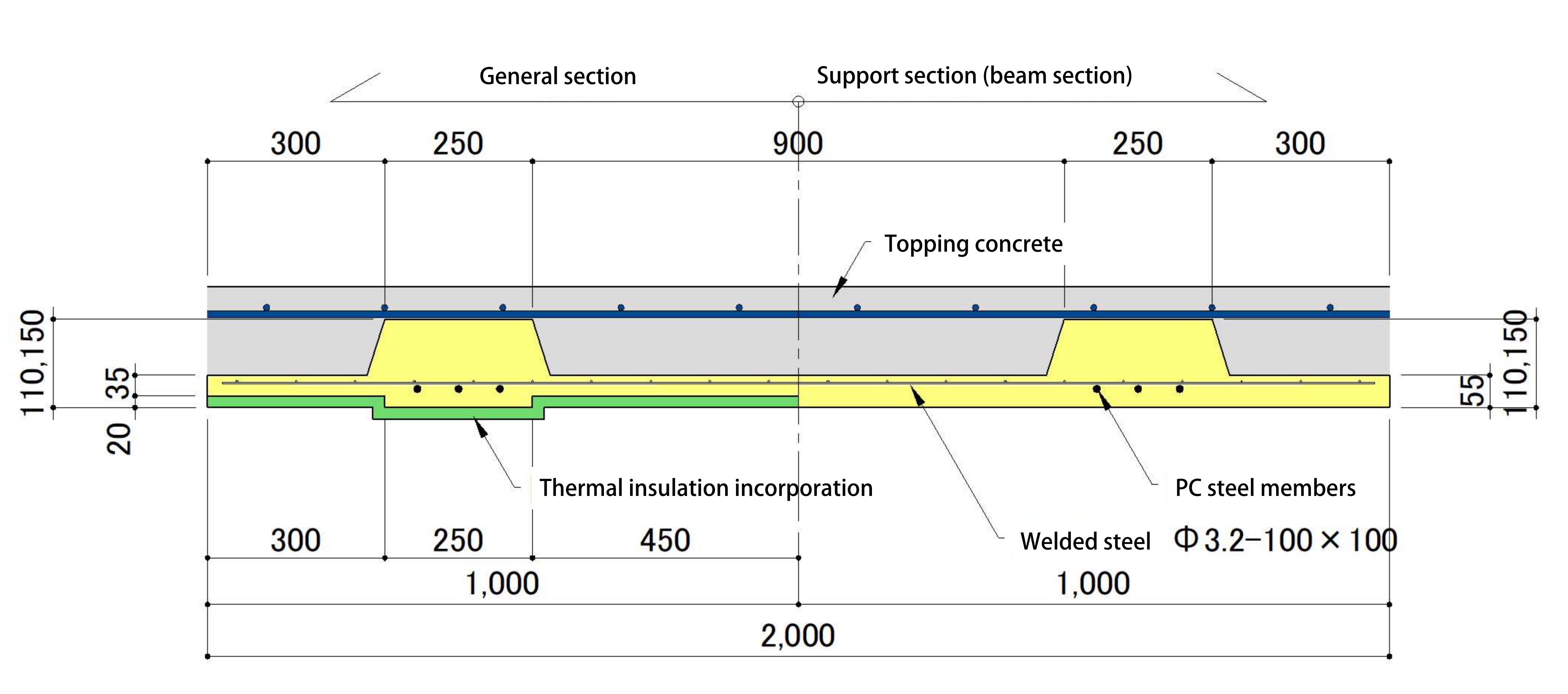 DM slabs are inverted, T-shaped precast concrete slabs which have thermal insulation on their bottom surface and which are used for the lowest floor. PC steel members inserted into the ribbed sections are used to prestress the slabs.