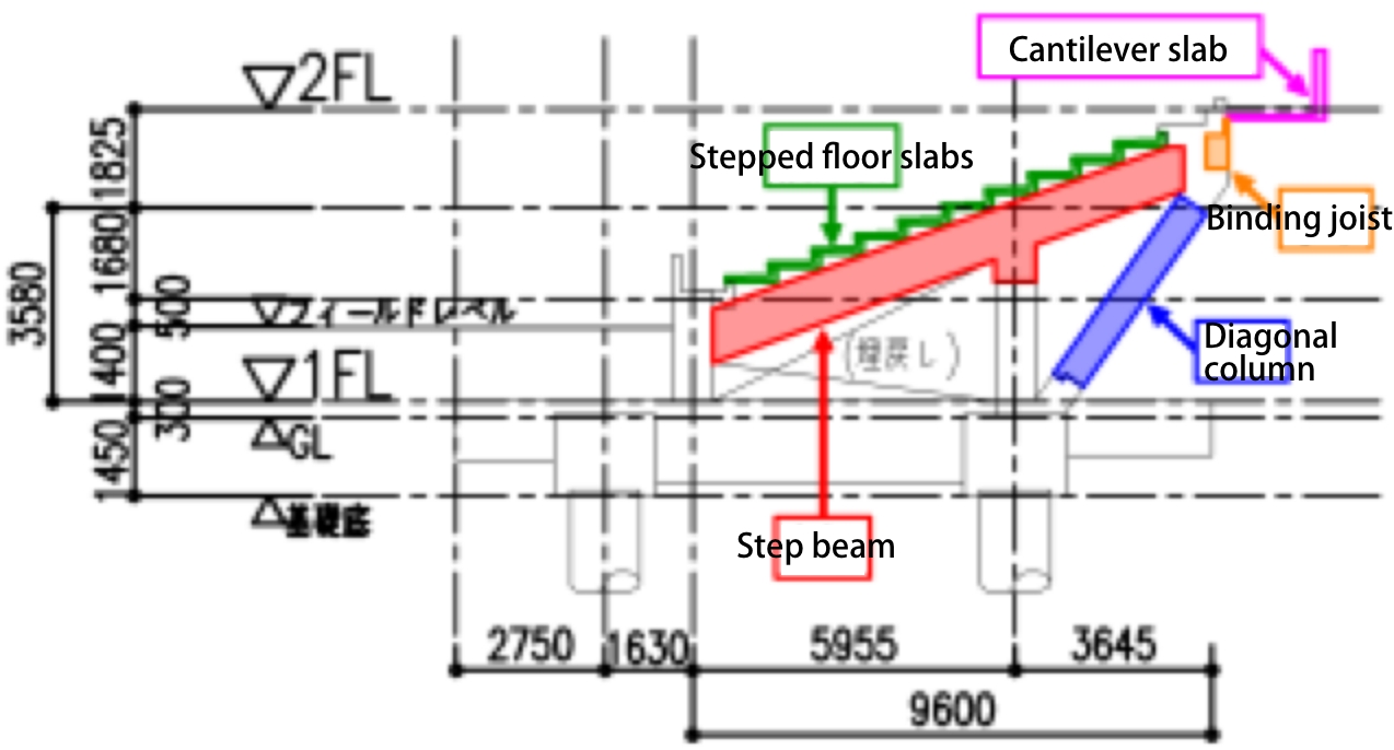 Also, precast PC members allowing for longer spans were utilized for the stepped floor slabs.