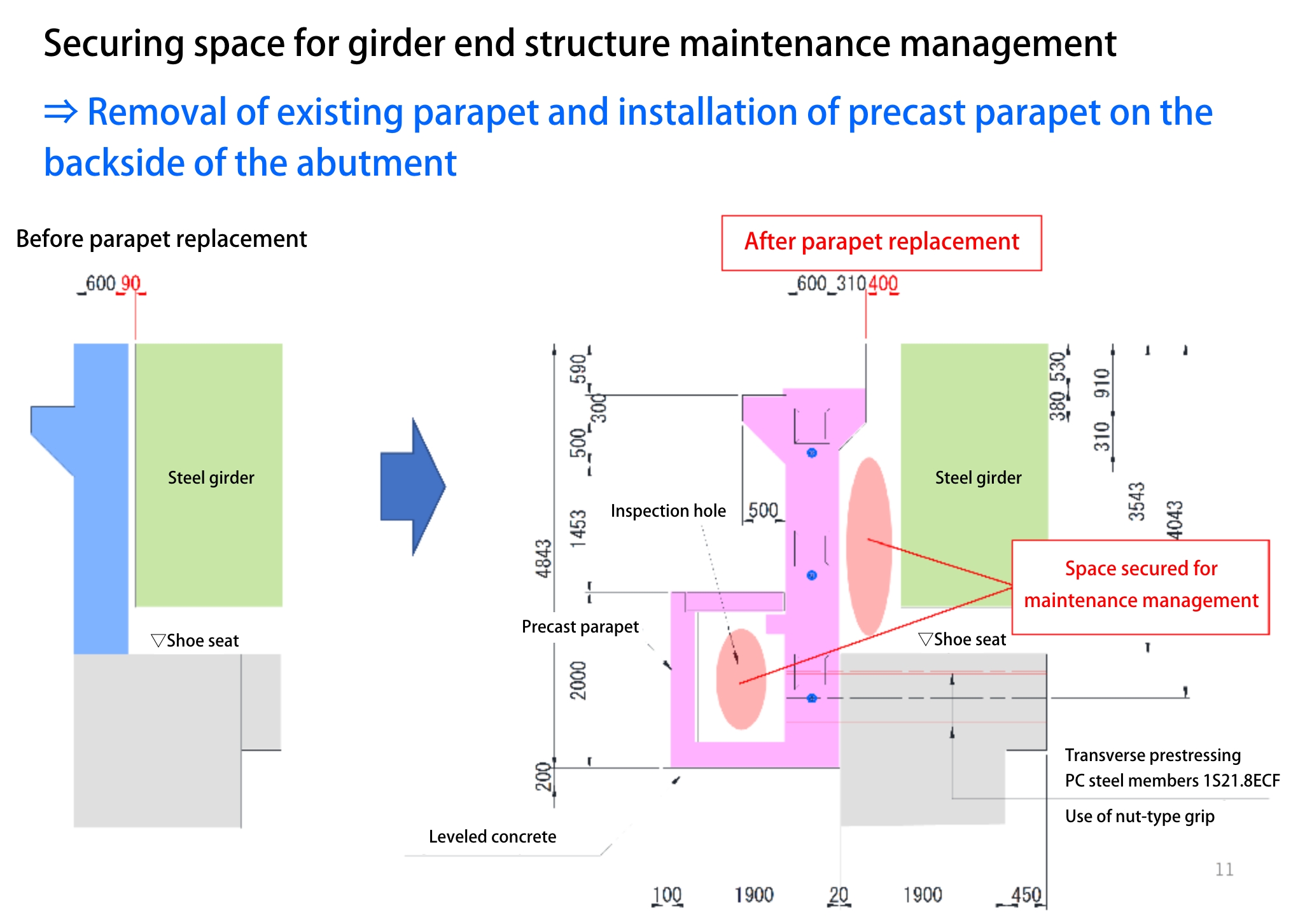 Parapet replacement was performed in order to ensure better seismic performance during earthquakes, as well as to improve maintenance management of girder end structures which incorporate expansion devices. And, given the significant impact on the community caused by lengthy highway traffic restrictions, precasting of parapet members was performed in order to shorten the construction period, as well as to improve durability.