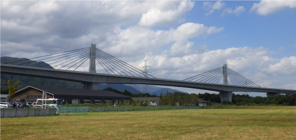 The term "extradosed” in extradosed bridges is derived from “extra” (outside the range (outside of the main girder)) combined with “dosed” (reinforced). In other words, it is a structure which uses an arrangement of PC steel members to provide reinforcement outside of the main girder. That fact on its own makes it hard to differentiate this type of bridge from a cable-stayed bridge, and when considered in terms of elements strongly associated with landmarks (e.g., sightseeing spots), some people may come to the conclusion that “cable-stayed bridges = extradosed bridges” due to the many points of similarity; however, extradosed bridges have the following notable characteristics.