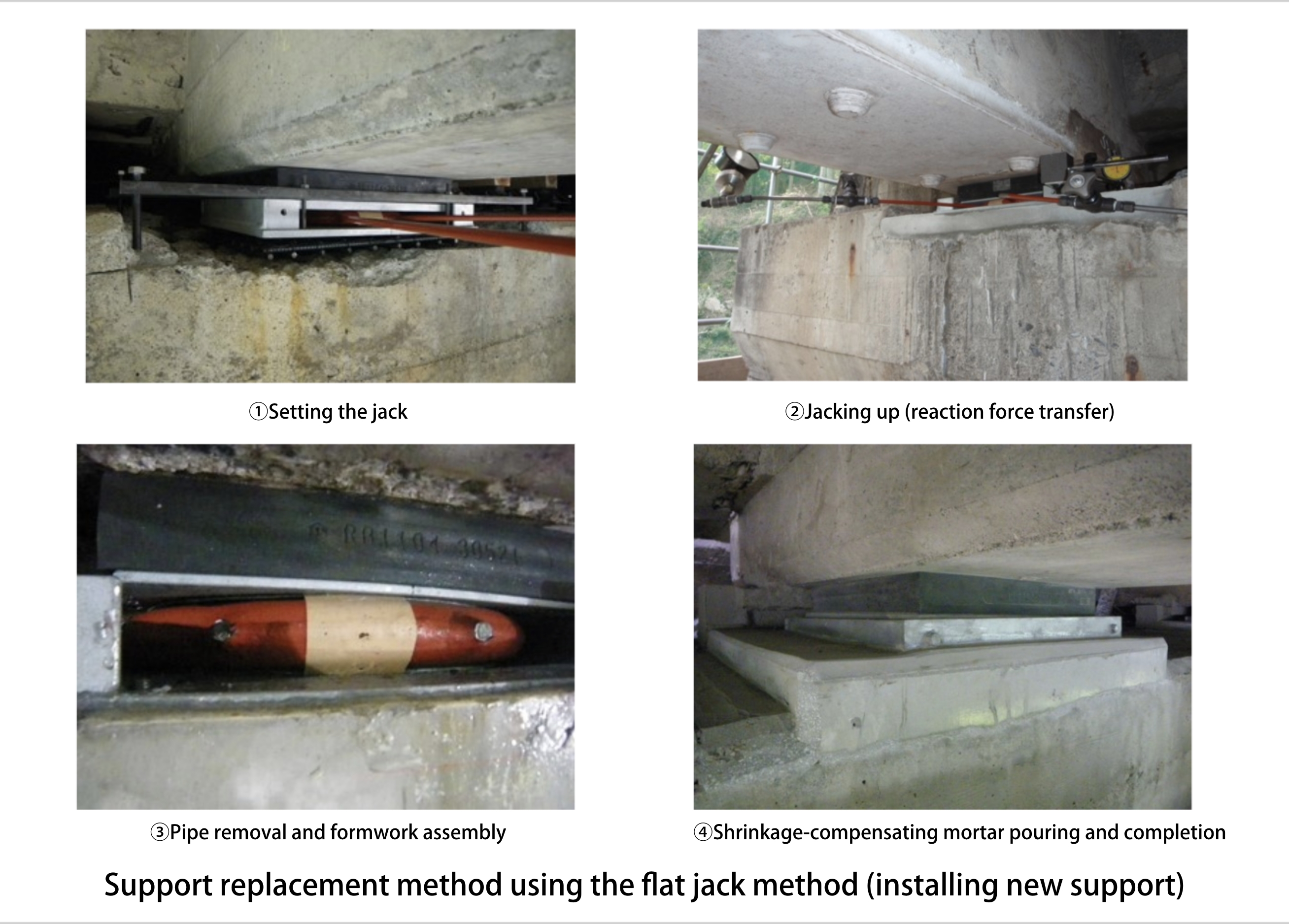 Because the work involves manipulation of heavy objects in narrow locations and performing the work while the structure is in service, consideration must be given during the planning phase to the materials, machinery and methods that will be used. The photos below show application of the flat jack method in jacking up main girders.