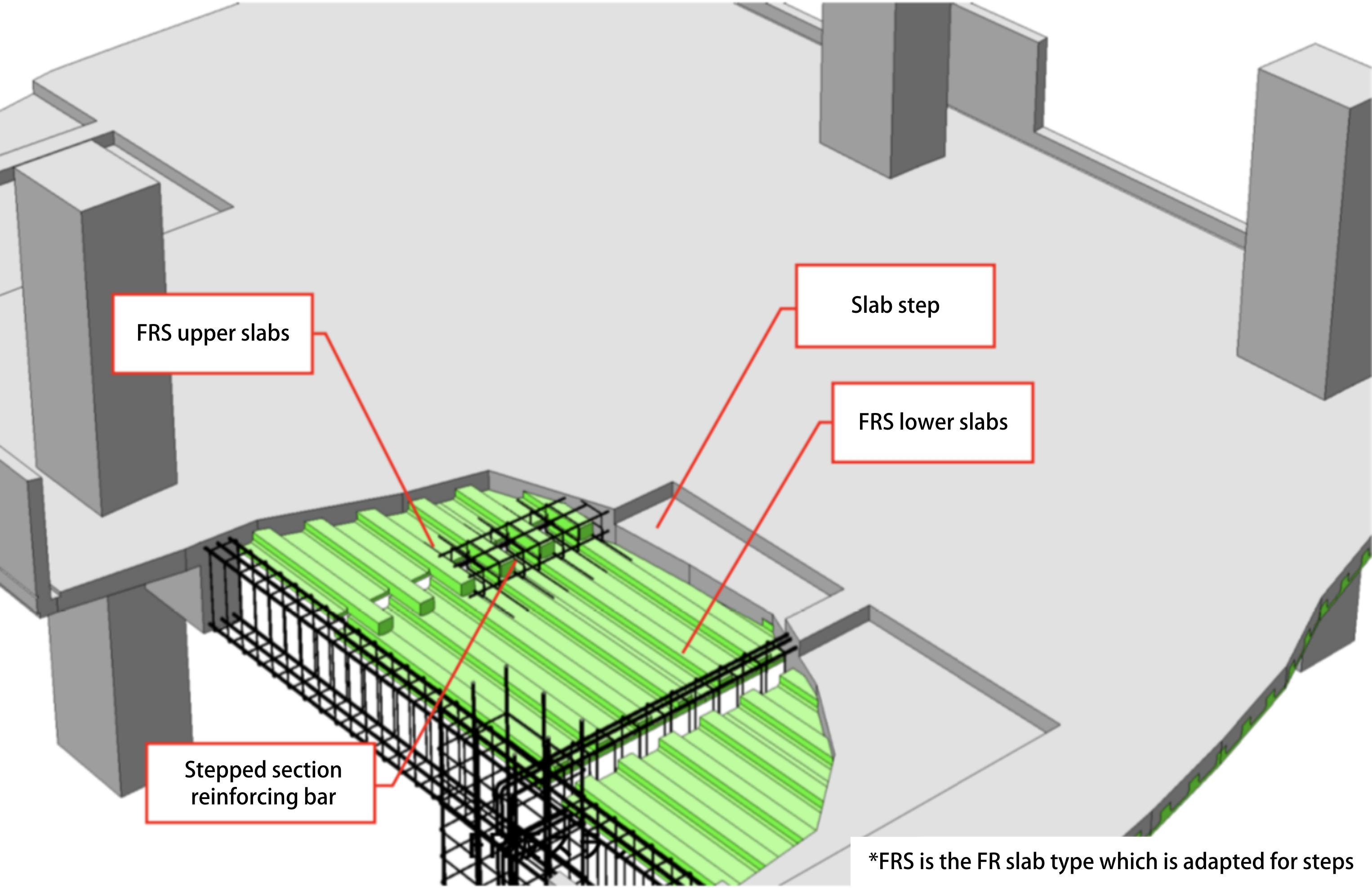 FR slabs are inverted, T-shaped, ribbed precast concrete slabs which are flat on their bottom surface and ribbed on their top surface. PC steel members inserted into the ribbed sections are used to prestress the slabs. The FR slab method is a half-precast composite floor slab construction method which involves laying FR slabs atop a beam formwork, arranging top reinforcements and then pouring cast-in-place concrete to integrate everything together. It is an environmentally friendly ecological product due to the fact that it does not utilize wooden formwork during production at the plant, nor during on-site construction.