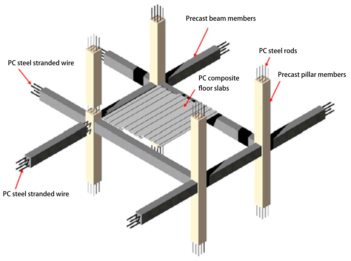 The PCaPC (Precast-Prestressed Concrete) method involves using lifting equipment and other equipment to perform on-site assembly of precast (PCa) members, made beforehand at a factory, and then introducing prestress to pressure bond the PCa members into a framework.