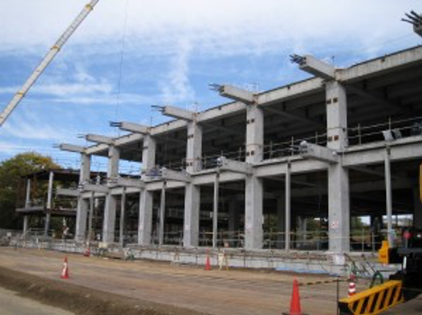 Because a pressure bonding method is used on the precast members, the frame construction period is shortened.