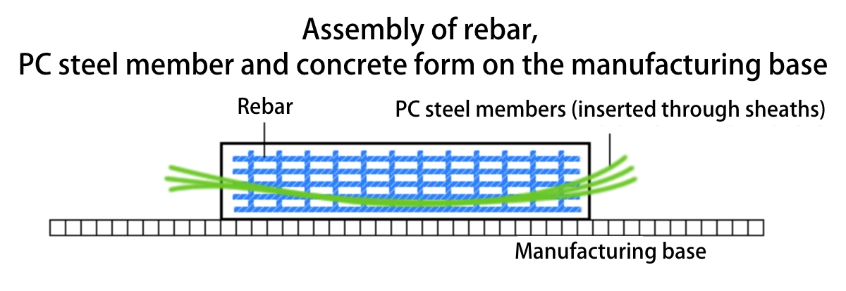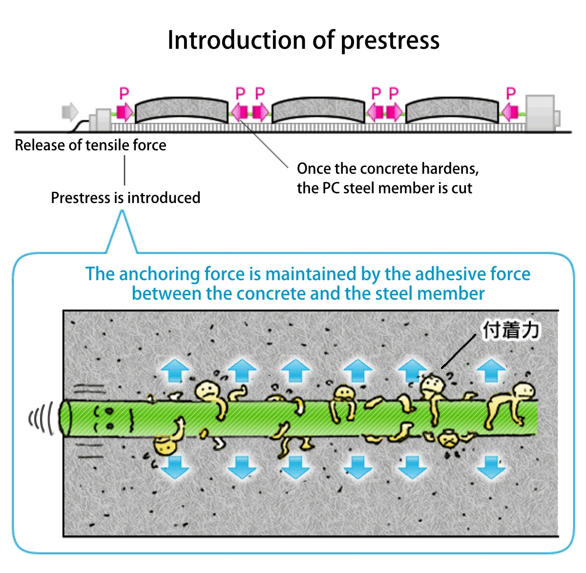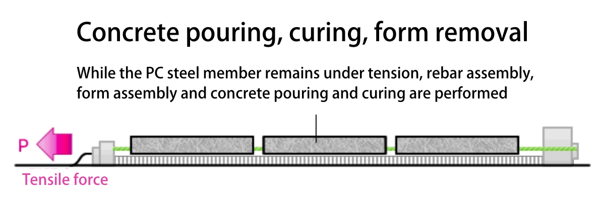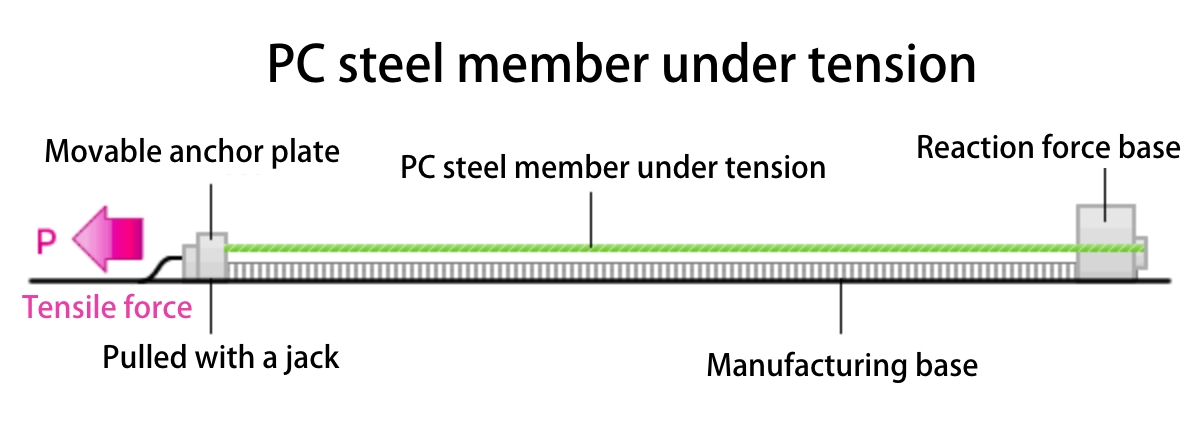 In the pre-tension method, PC steel members are first put under tension at a predetermined force and position; the concrete is poured into place and allowed to harden; then, the tension in the PC steel members is released, thereby prestressing the concrete via its adhesion with the PC steel members.