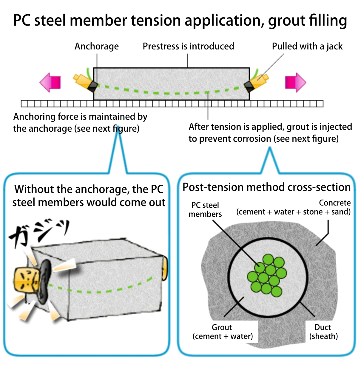 In the post-tension method, once the concrete member has hardened, tensile force is applied to the PC steel members inserted into ducts (known as “sheaths”) within the concrete, with this tensile force being maintained by the PC anchorage affixed to the ends of the PC steel members as prestress is applied to the concrete. Thus, the post-tension method is not limited to precast members but, rather, can be easily used for structures which are poured at the work site. Additionally, a key feature of this method is that it allows for great latitude in choosing the amount of tensile force to be applied.