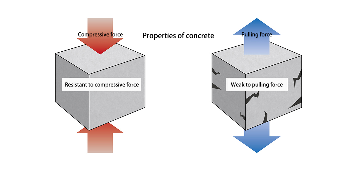 One method of compensating for concrete's weakness to pulling force is to use “reinforced concrete (RC).”