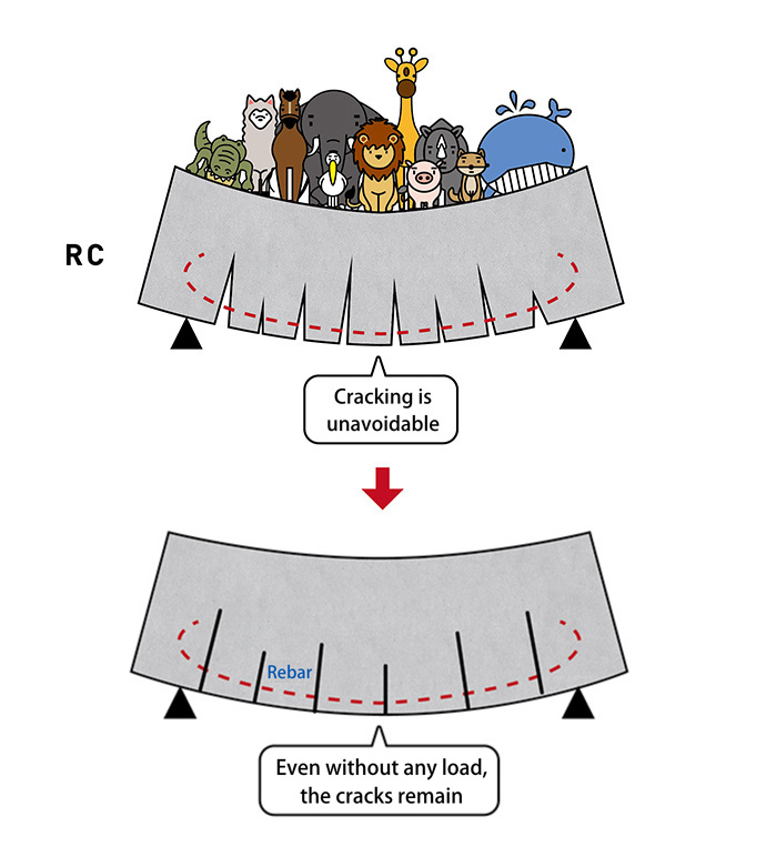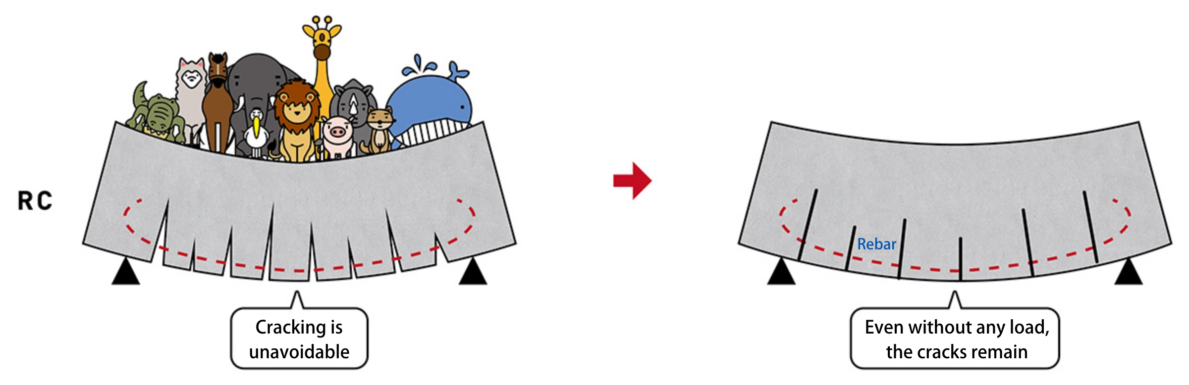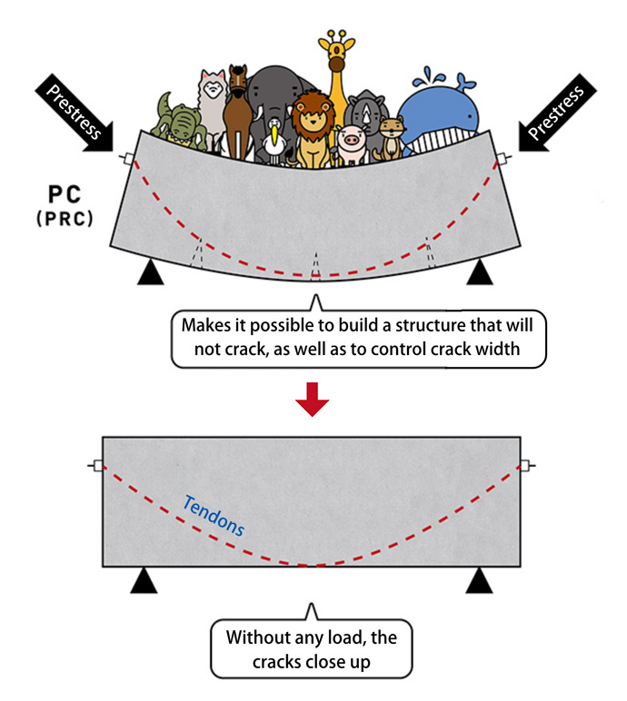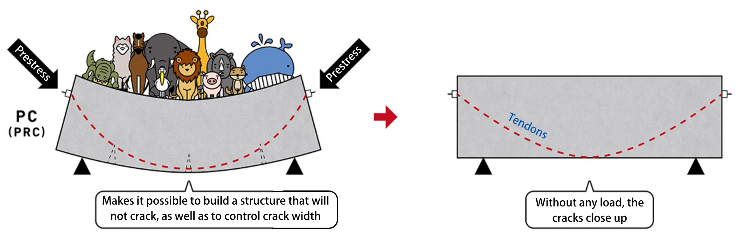 Thus, a method was developed whereby compressive stress is applied beforehand via the use of tendons to (prestress) concrete in order to prevent cracks from forming. With this method, concrete cracking can be arbitrarily controlled, even when significant pulling force is applied, by prestressing the concrete. This is “prestressed concrete (PC).”